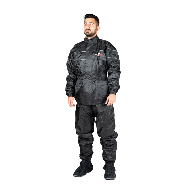 חליפת גשם עשויה בד ניילון פוליאסטר ותפרים מולחמים בטכנולוגיה שאוטמת את החליפה 100% למים, בטנת viscose quilt איכותית לנוחות לבישה ושמירה על חום הגוף, מחזירי אור להגברה הבטיחות לנראות בחושך, שני כיסים קדמיים גדולים בחזית, כיסוי כפול לארוך הרוכסן הראשי למניעת חדירת מים דרך שיני הרוכסן, גומיות מכווצות בקצה השרוולים ובקצה התחתון של המכנסיים.